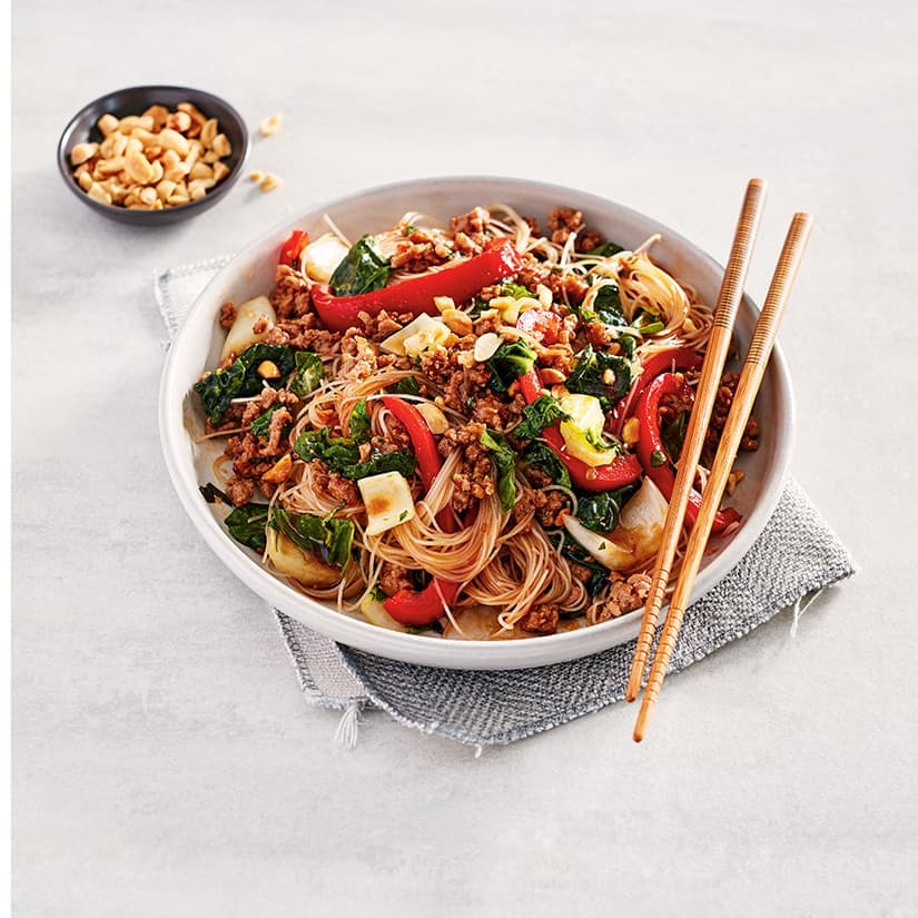 - Dans un grand bol à l'épreuve de la chaleur, mettre les vermicelles et couvrir d'eau bouillante. Laisser reposer de 4 à 5 minutes ou jusqu'à ce qu'ils aient ramolli. Égoutter et réserver.