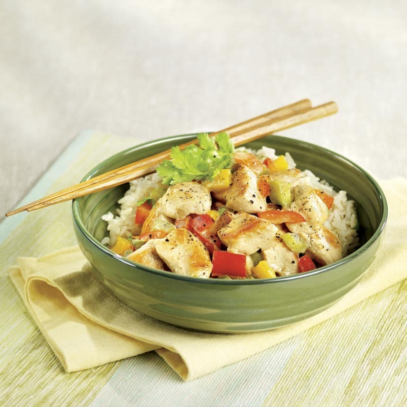 - Dans un poêlon à surface antiadhésive, chauffer l'huile à feu moyen-vif. Faire sauter le poulet pendant environ 5 minutes ou jusqu'à ce qu'il soit doré. Saler et poivrer. Ajouter la sauce de cari et cuire, en brassant, pendant 1 minute. Ajouter le lait de coco et porter au point d'ébullition. Réduire le feu et laisser mijoter de 3 à 4 minutes.