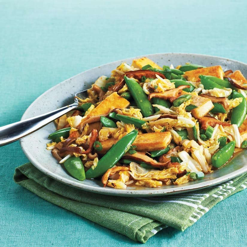 - Chauffer le reste de l'huile à feu moyen-vif et cuire la partie blanche des oignons verts avec l'ail et le gingembre, en brassant, pendant 1 minute. Ajouter les pois mange-tout et les champignons et cuire, en brassant, pendant 3 minutes. Ajouter le chou et cuire, en brassant, pendant 1 minute. Ajouter le mélange de bouillon et le tofu réservés, et cuire, en brassant, pendant environ 1 minute ou jusqu'à ce que le tofu soit bien enrobé et que la sauce ait épaissi.
