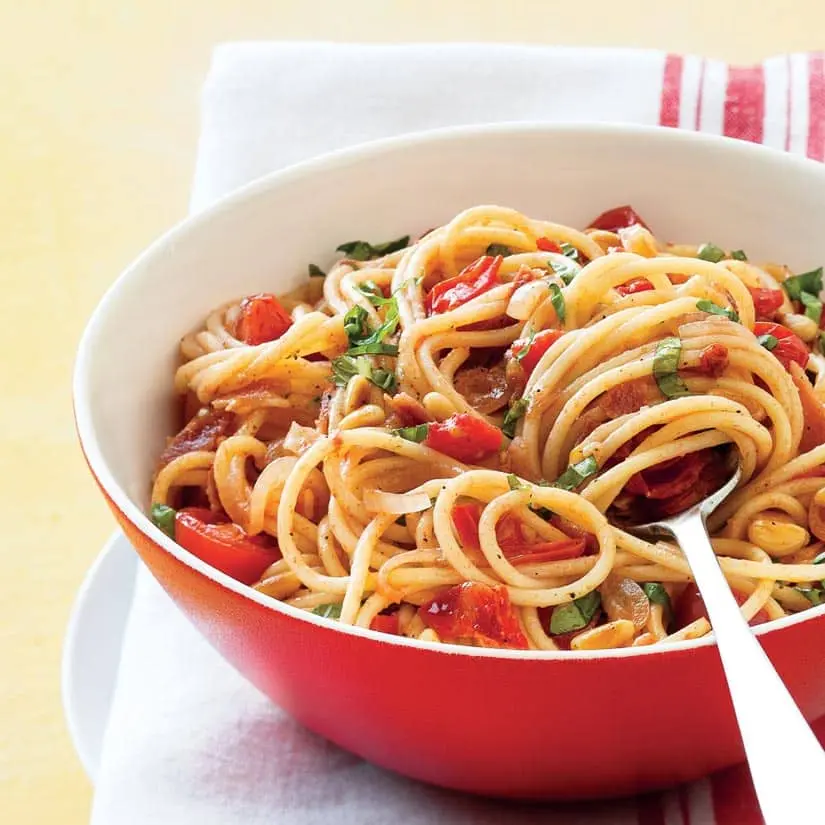 Spaghettis à la pancetta, aux tomates cerises et au basilic
