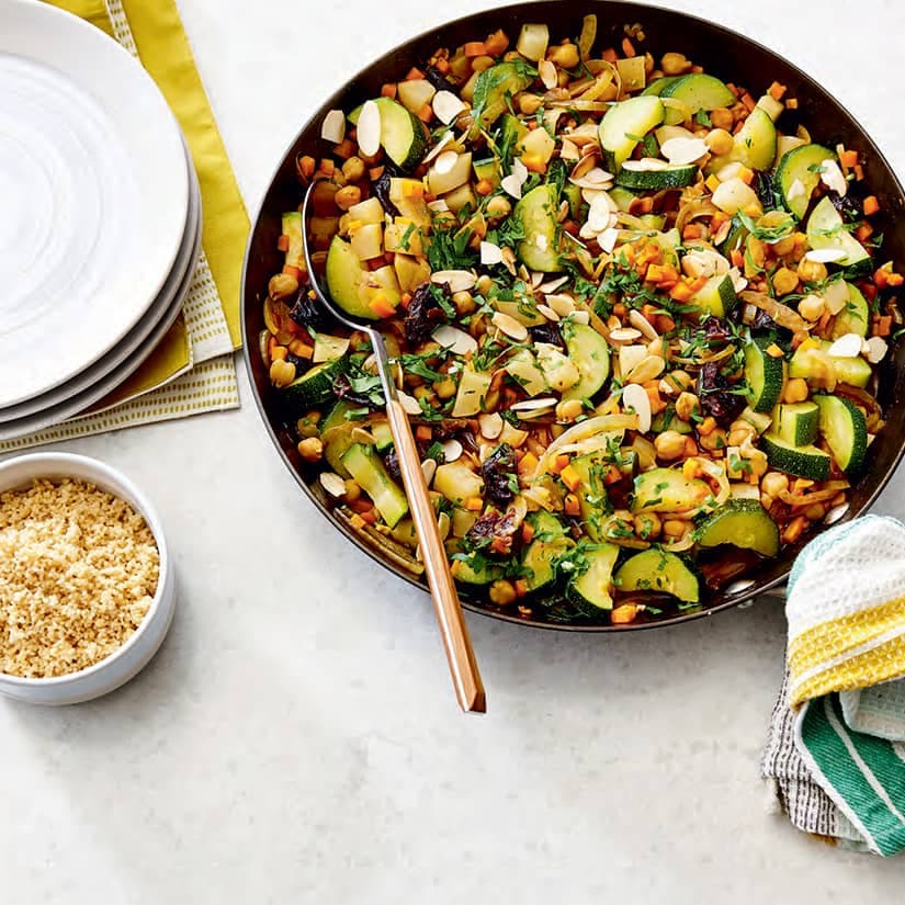 1. Dans une grande casserole, chauffer l’huile à feu moyen. Ajouter l’oignon et l’ail, et cuire 3 minutes. Ajouter l’assaisonnement ras el hanout, la pâte de tomates et la sauce harissa, si désiré, et poursuivre la cuisson 2 minutes en brassant. Saler. Ajouter le bouillon, les légumes, les pois chiches et les pruneaux, et mélanger en raclant le fond de la casserole. Porter à ébullition. Réduire le feu et laisser mijoter, à couvert, 15 minutes ou jusqu’à ce que les légumes soient tendres. (Le tajine se conservera jusqu’à 5 jours au réfrigérateur ou jusqu’à 3 mois au congélateur.)