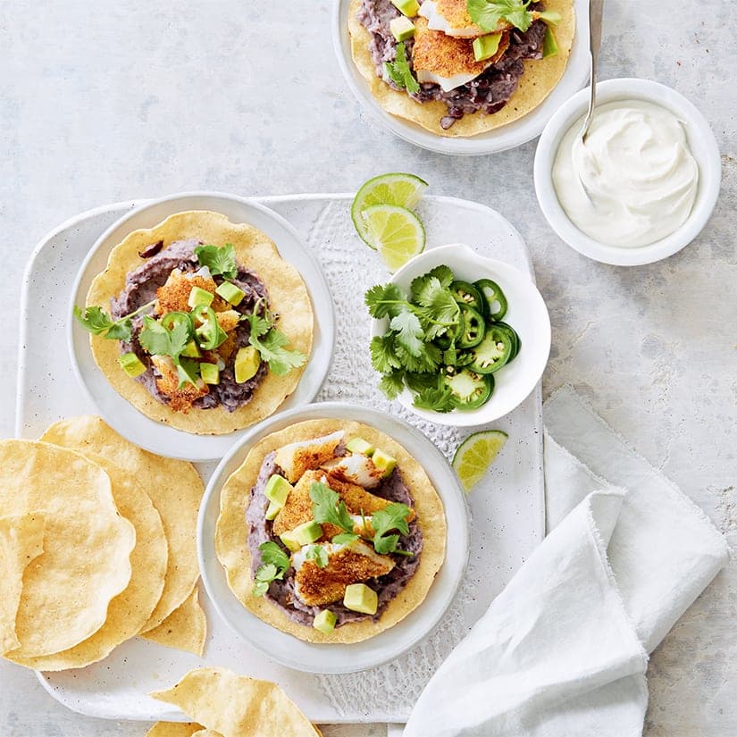 - Garnir les tostadas de la purée de haricots réservée, du poisson, des avocats, du piment et de coriandre. Servir avec la crème sure et la lime, si désiré.