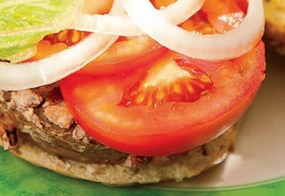 2. Assembler les végéburgers dans un petit pain de blé entier chaud avec les tomates, la laitue et les oignons rouges arrosés d'un bon filet de vinaigrette tahini.