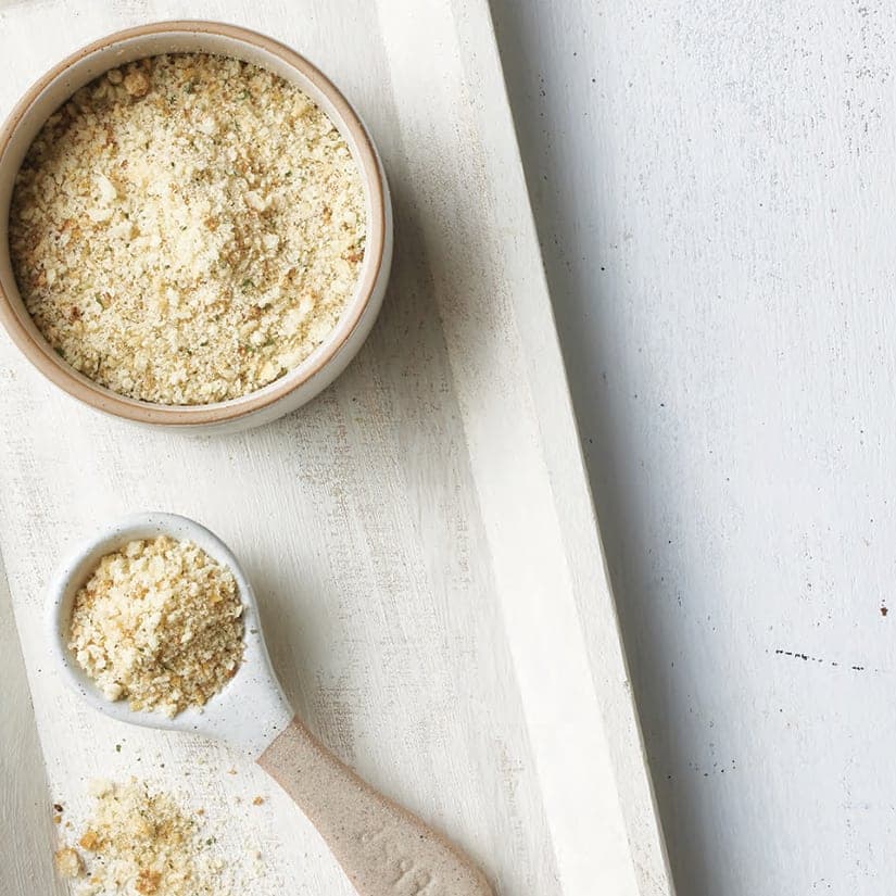 - Au robot culinaire, en actionnant et en arrêtant l'appareil, mélanger le pain, les fines herbes séchées, les poudres d'ail et d'oignon, le sel et le parmesan, si désiré, jusqu'à ce que la préparation ait la texture d'une chapelure fine. (La chapelure se conservera jusqu'à 2 jours au réfrigérateur ou jusqu'à 6 mois au congélateur. Si l'on omet le parmesan, la chapelure se conservera jusqu'à 2 mois à la température ambiante.)