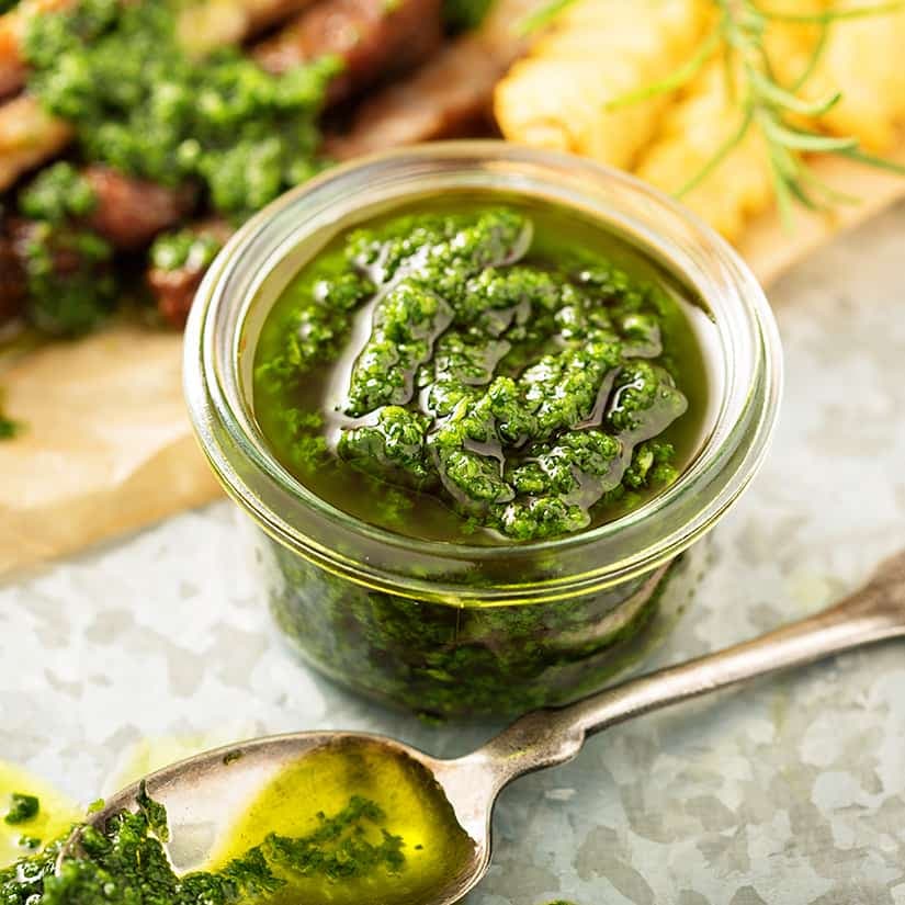 - Au robot culinaire, en actionnant et en arrêtant l'appareil, hacher finement le persil, la coriandre et les oignons verts avec le vinaigre de vin rouge, l'ail, le sel, le poivre et les flocons de piment fort. En actionnant l'appareil, incorporer l'huile d'olive en un mince filet jusqu'à ce que le mélange soit lisse. Incorporer l'eau de la même manière, jusqu'à ce que la sauce ait la consistance désirée.