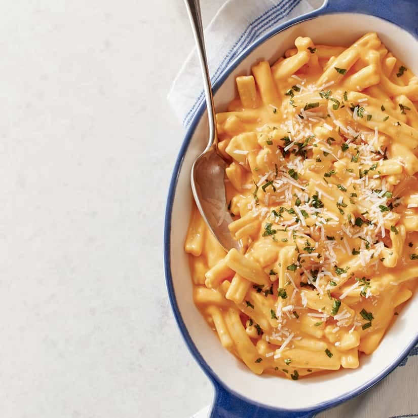 - Mettre la courge, le chou-fleur et le reste des ingrédients dans le mélangeur. Saler et poivrer. Pulser jusqu'à consistance lisse. Si la sauce semble trop épaisse, ajouter un peu d'eau, au besoin. Réchauffer dans une petite casserole à feu moyen, si nécessaire. Garnir de faux-mage râpé, si désiré, et de persil frais.