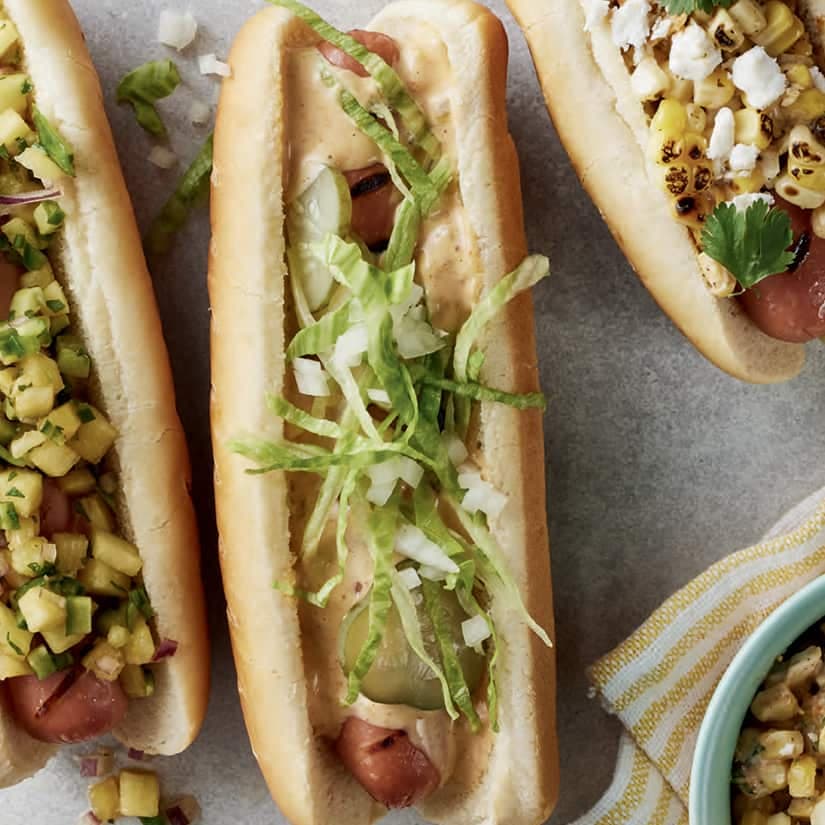 - Au moment de servir, garnir les hot-dogs de la sauce. Parsemer des garnitures choisies.