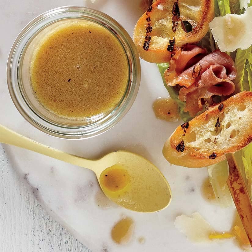 - Dans un bol, à l'aide d'un fouet, mélanger le jus de citron, l'huile, le vinaigre, la pâte d'anchois, la moutarde de Dijon, le zeste de citron, l'ail et le poivre jusqu'à ce que la vinaigrette soit homogène.