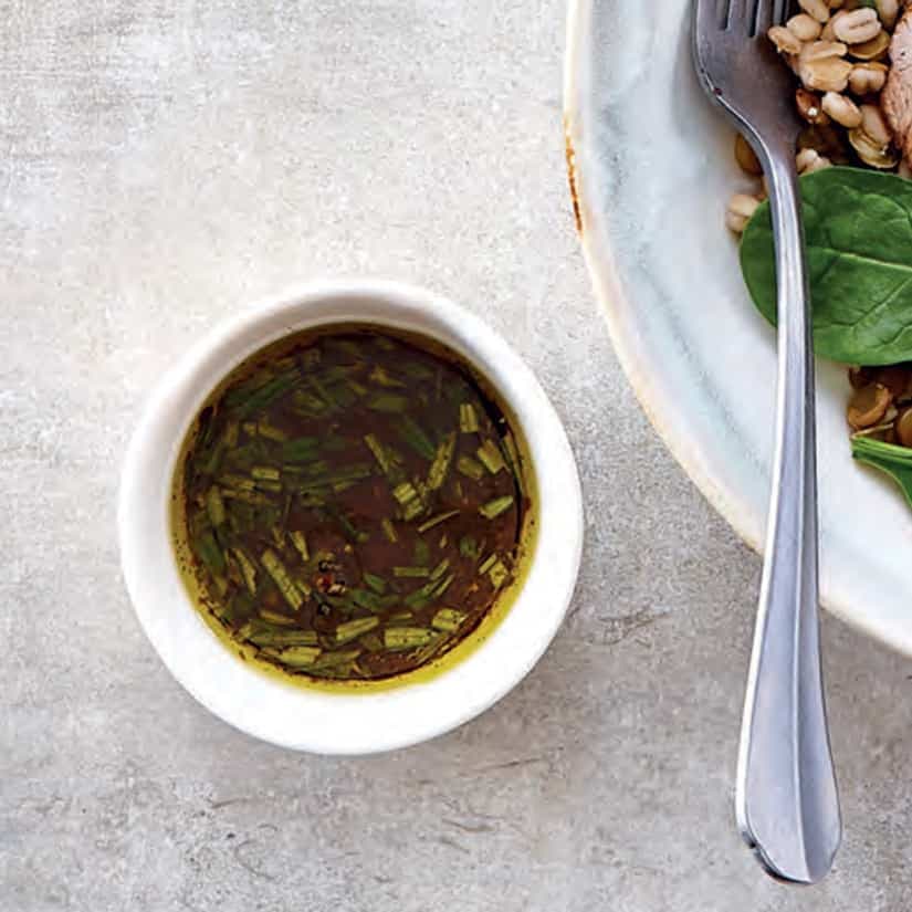 - Dans un petit bol, à l'aide d'un fouet, mélanger l'huile d'olive, le vinaigre balsamique, la moutarde à l'ancienne et le romarin. Saler et poivrer (La vinaigrette se conservera jusqu'à 2 jours au réfrigérateur.)