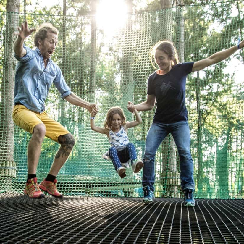 Il y a les filets qui comptent un trampoline à deux étages, trois glissades, des tunnels, des passages secrets et une vigie. Il y a aussi un village aérien, un vrai labyrinthe relié par des ponts suspendus, dans lequel sept maisonnettes colorées, dont deux à deux étages, sont accrochées aux arbres. Bref, les familles ne s’ennuieront certainement pas dans l’univers de Uplå.