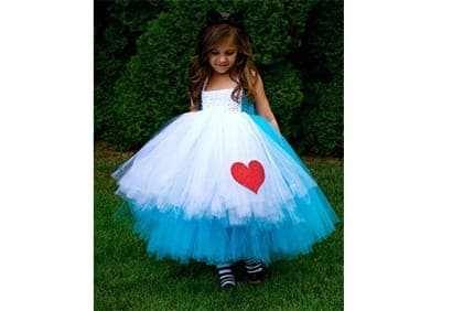 Pour confectionner un costume semblable, on choisit une camisole ou un pull bleu sur lequel on coud des bandes de tulle blanches et bleues, en couches superposées. Si on n'est pas très habile et que notre couture est un peu disgracieuse, on appose un ruban large (noir ou blanc) directement sur la couture. On termine le costume en collant un coeur en feutre rouge sur la robe. On coiffe les cheveux de notre mignonne Alice avec une boucle noire et on lui fait enfiler des bas rayés blanc et noir. La voilà prête pour le pays des merveilles!