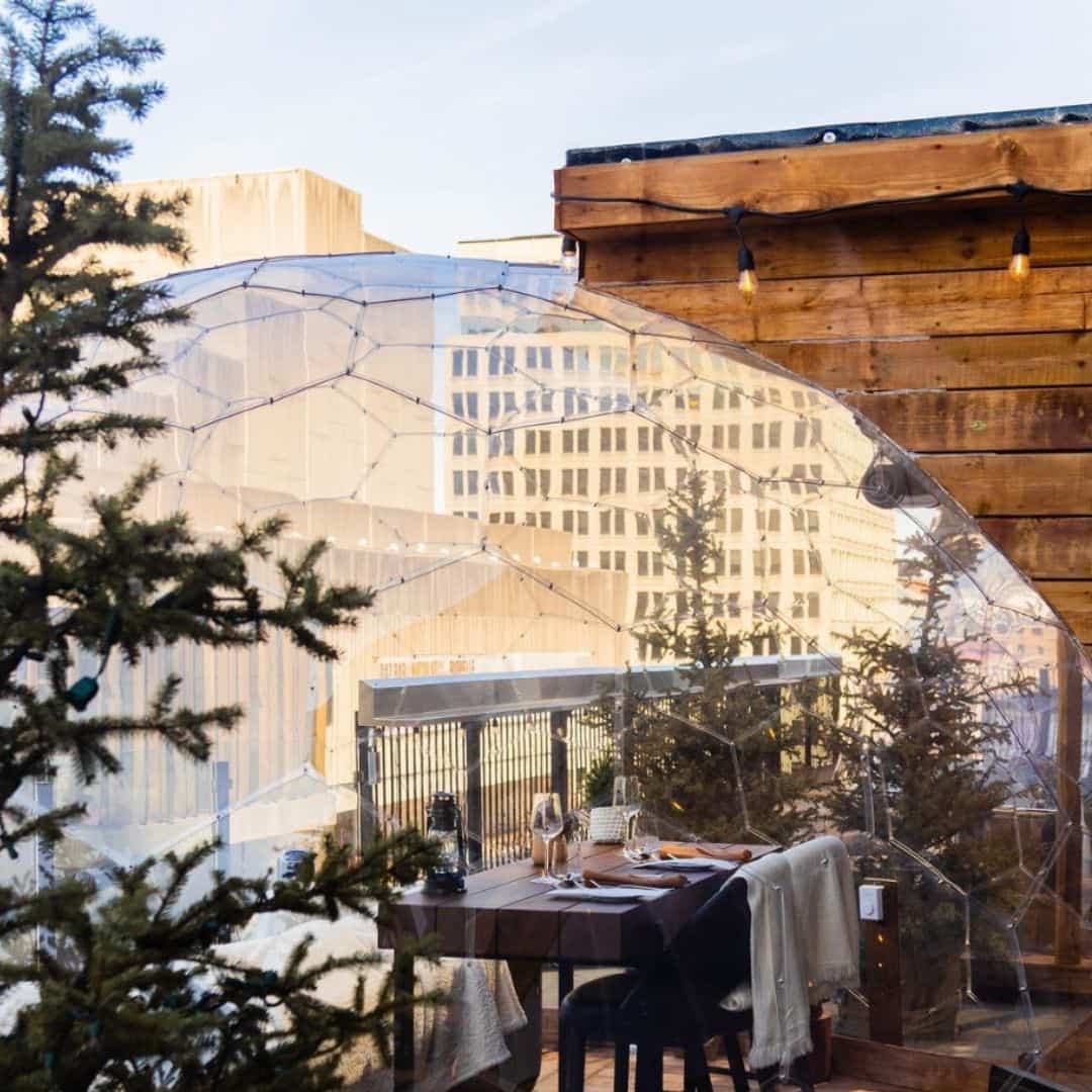Surplombant le Quartier des Spectacles (qui s’illumine l’hiver en raison de Montréal en Lumières et Luminothérapie), deux de ces dômes géodésiques, chauffés et transparents, peuvent accueillir jusqu’à 10 personnes.