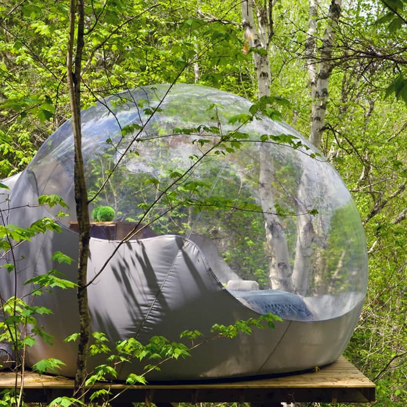 À L’Anse-de-Roche, en bordure de la rivière Saguenay, les bulles de Canopée Lit proposent aux amoureux de la nature de ne faire qu’un avec la forêt. Ces chambres sphériques et transparentes, pouvant accueillir deux à quatre personnes, sont perchées dans les arbres, au cœur de 24 hectares boisés. Ainsi, on peut y observer la faune, la flore et la nuit étoilée en toute intimité. Des toilettes privées se trouvent à proximité de chaque bulle et une salle de bains commune est accessible à l’accueil. Info: canopee-lit.com