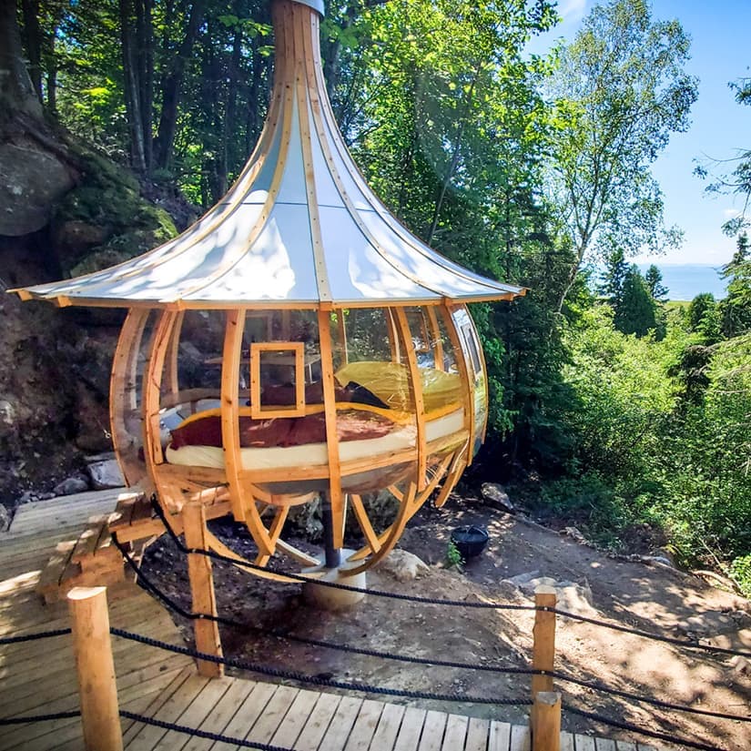 Installées sur les parois du Kamouraska, les 5 cabanes du Cirque de la Pointe-Sèche repoussent les limites de l’originalité. Inspirés du monde du cirque, ces petits prêts-à-camper fantaisistes, tous différents, sont presque complètement transparents. Ils n’ont ni eau courante, ni douche, ni électricité, mais offrent lit et literie, petit-déjeuner et vues uniques sur le Saint-Laurent. De bien jolis nids pour les amoureux.