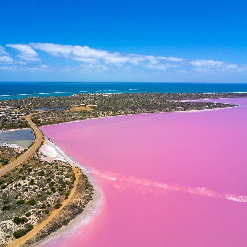 Il y a de nombreux lacs roses dans l'ouest de l'Australie. Celui-ci est situé sur Middle Island. Les scientifiques ne semblent pas s’entendre sur la raison de sa couleur Fraisinette. Certains l’expliquent par son extrême salinité, d’autres par la présence de micro-organismes. Les touristes peuvent s’y rendre en bateau ou le survoler à bord d'un petit avion.
