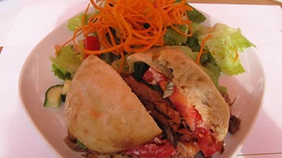 Toute la semaine, Katerine-Lune parcourt la route des Cafés de village dans les Cantons-de-l’Est. Tuyau bouffe du jour : le club sandwich au canard confit du Café bistro Les Trois Grâces. Fait avec du canard du lac Brome et servi avec une salade, c’est assurément un classique à manger sur leur magnifique terrasse aux abords de la rivière Missisquoi. Niché en plein cœur d’Eastman, ce restaurant a vu le jour il y a quatre ans... sur le parvis de l’église. Les deux copropriétaires avaient envie d’un établissement à mi-chemin entre les cantines et nappes blanches du coin. Aujourd’hui, les gens du village viennent y déjeuner, prendre un café ou casser la croûte: c’est devenu un lieu de rassemblement. « Tout le monde se connaît, et par la force des choses, on devient un peu l’été un centre touristique pour aider les gens à trouver un camping ou des activités à faire. On a même déjà suggéré un plombier à des gens qui avaient loué un chalet où il y avait un dégât d’eau. Le plombier était assis ... à la table à côté » raconte la joviale copropriétaire Ève Rozon. [/caption] [caption id="attachment_4853" align="alignnone" width="410"]