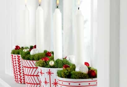 Placer le lichen autour de la chandelle et le fixer à l’aide de colle chaude. Attention de ne pas mettre de colle sur la bougie afin de pouvoir la remplacer, au besoin. Ensuite, coller les boules décoratives avec un point de colle chaude.