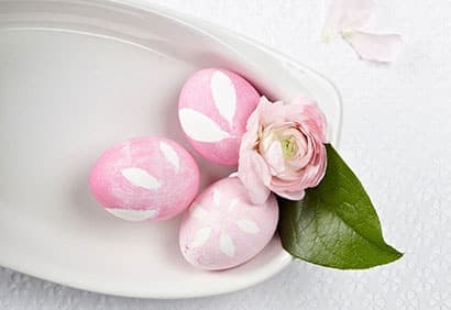 Un classique de Pâques revu et corrigé. Demandez aux enfants de ramasser des petites feuilles à l'extérieur: elles serviront de pochoirs.