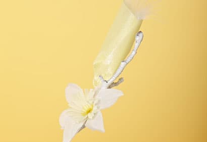 2. Enrouler une bande de papier autour de son index - la forme n'a pas à être parfaite, chaque fleur est unique. Retirer le doigt, pincer la base, la tordre légèrement et la fixer à la branche à l'aide du ruban adhésif.