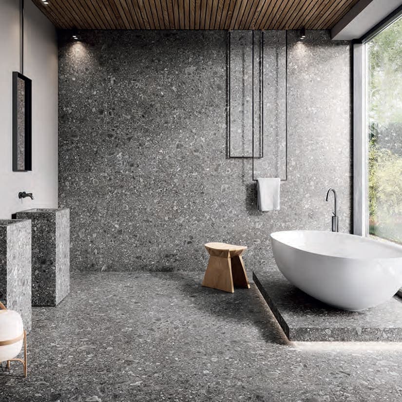 Jeux de textures en ton sur ton, veinures prononcées, effet béton, terrazzo... Le choix de revêtements de sol et de murs en céramique ou en porcelaine est très diversifié, tant sur le plan des motifs que sur celui des formats, qui peuvent être surdimensionnés (42 po x 42 po) ou en version mini, façon mosaïque.