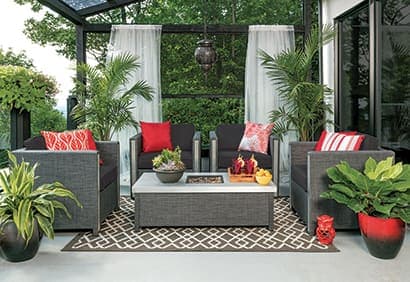 Pour prolonger la journée même si la fraîcheur se fait sentir, ce salon de jardin en oléfine d’une durabilité supérieure s’assortit d’une table intégrant un foyer au propane. 1499$ l’ensemble comprenant quatre fauteuils, un foyer, des pierres de lave, une housse protectrice, un support de bonbonne et un tuyau de bonbonne de 10 pieds de longueur. Collection Soho, de RONA.