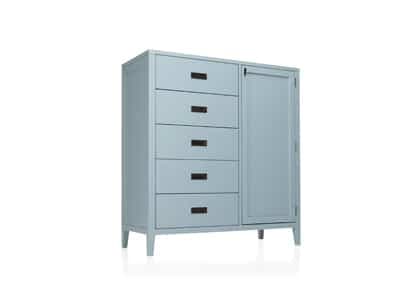Malgré son aspect légèrement industriel, on est folles de sa couleur bleu bébé, qui apportera une touche de douceur à n’importe quelle chambre à coucher. Commode Arch Blue à 5 tiroirs et 1 compartiment, en peuplier et bois d’ingénierie, 47 po x 20 po x 51 po. 1 199$, chez Crate & Barrel.
