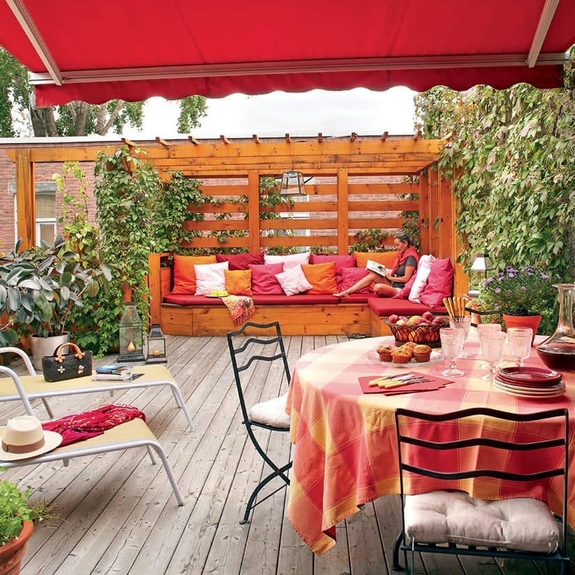 Les unis jaune, crème, blanc et rouge font partie des intemporels, ainsi que les rayés marine et blanc ou vert foncé et blanc. Sur cette terrasse, les balconnières intégrées au treillis derrière le barbecue ferment le coin-repas et y ajoutent une agréable note fleurie.