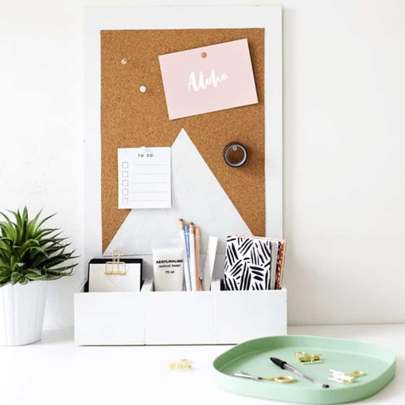 Pratique et épuré, cet accessoire de bureau regroupe un babillard en liège et trois casiers pour que les menus objets ne traînent plus partout.