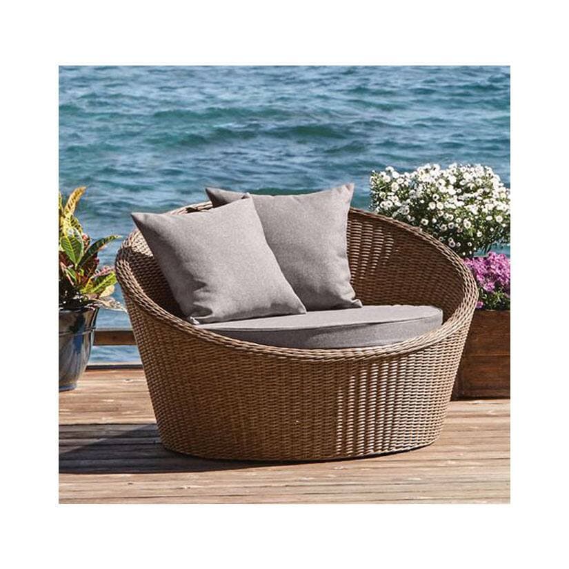 Fauteuil de rotin avec base en acier «Devon» de «Hometrends». Comprend le fauteuil, un coussin de siège et deux coussins décoratifs.