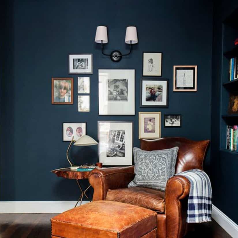On éclaire un mur foncé en y accrochant des cadres blancs, parfaits comme touches de lumière.