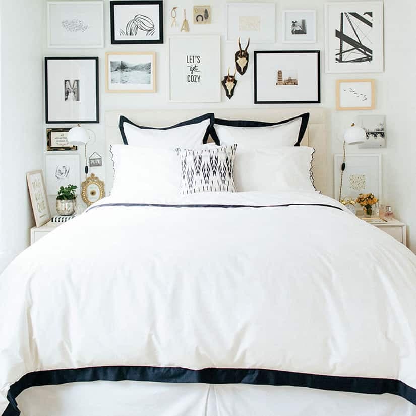 Les draps et les cadres soulignés de noir rendent l’espace chic sans le réduire ni l’assombrir, le blanc étant omniprésent.