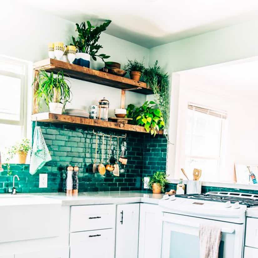 D’épaisses planches ornées de plusieurs plantes vertes donnent du caractère et de la vie à la plus simple des cuisines.