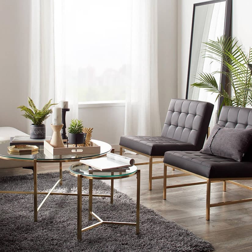 Des tables au plateau de verre procurent également un sentiment de légèreté. Si elles sont bienvenues dans le salon ou la salle à manger, elles le sont peu dans un bureau, car elles laissent voir le câblage. On a tendance à toujours placer ses meubles de la même manière, notamment en collant le sofa au mur, quitte à créer un effet couloir. Les agencer différemment peut rendre la pièce plus invitante et la circulation plus facile.