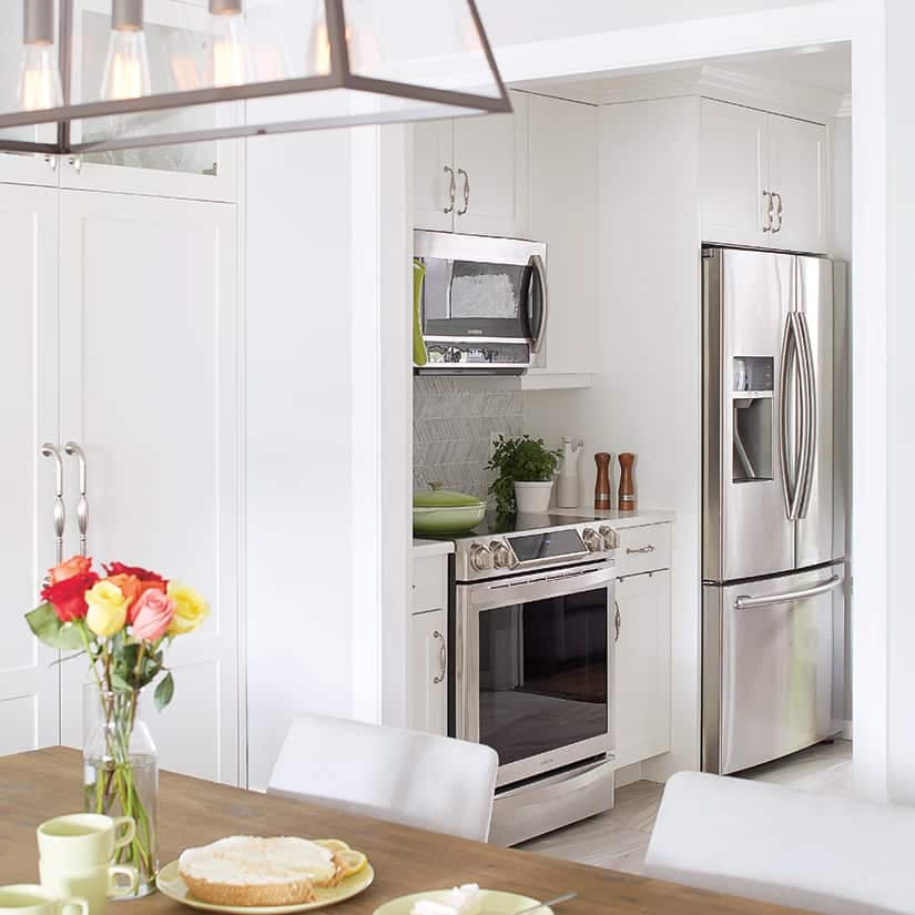 - Intégrer des armoires contemporaines qui se marient au reste de la maison, où dominent le blanc et le bois.