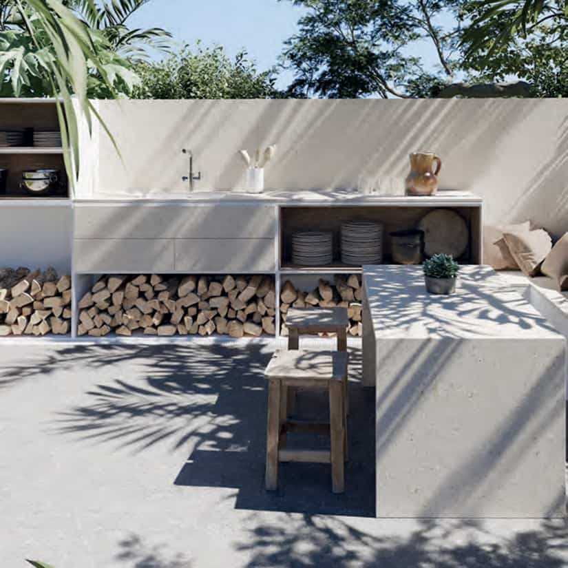 Le grès cérame a tout pour séduire. Cette matière résiste aux rayons UV et à la chaleur, en plus de se décliner dans une large gamme de couleurs, de finitions et de styles. On l’utilise pour les comptoirs, mais également pour les dosserets et autres composants extérieurs. Selon la finition choisie, le grès cérame peut servir à créer un look moderne autant que rustique.