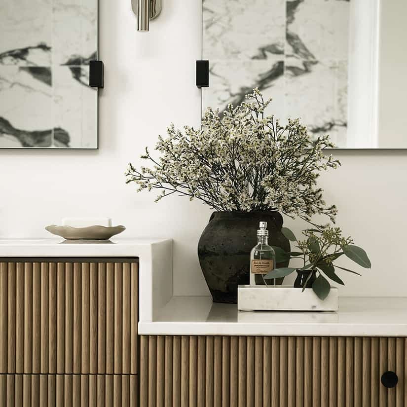 - Le meuble-lavabo aux façades en chêne blanc cannelé: une touche ultratendance qui apporte chaleur et texture à cet univers noir et blanc.