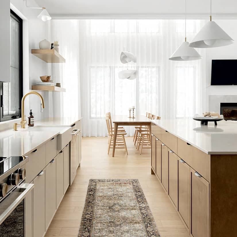 Si on décide de poser des spots au plafond, ils doivent être situés de manière à ne pas créer d’ombre sur les comptoirs. En ce qui concerne les suspensions au-dessus de l’îlot et de l’évier, on privilégie les modèles offrant un éclairage direct sur les surfaces plutôt que diffus (une boule de verre ou un abat-jour en rotin, par exemple); l’éclairage sera plus concentré, mieux adapté et plus confortable. Pour parfaire l’ambiance, on installe des luminaires, comme des bandes DEL, dans les armoires vitrées.