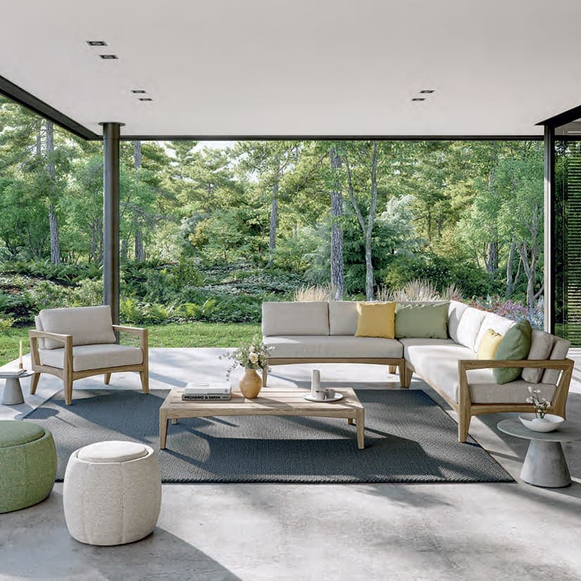 - L’utilisation de revêtements, de meubles et d’accessoires similaires à ceux qu’on trouve à l’intérieur et la conception de terrasses au style harmonisé à celui de la maison estompent la frontière entre le dedans et le dehors.