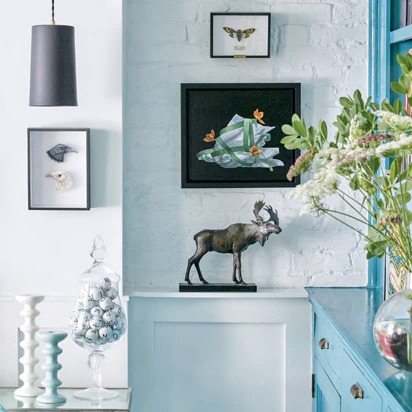 Au-dessus, une huche, dénichée dans une ruelle et repeinte du même noir, permet d’exposer les pièces d’antan en porcelaine et en verre que collectionne le couple. «Je raffole des intérieurs éclectiques dans lesquels on trouve des objets qui ont une histoire à raconter», indique le designer.