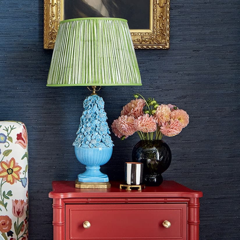 Les murs habillés d’un tissu bleu nuit confèrent à la pièce une ambiance aussi enveloppante qu’élégante. «Ma cliente appréhendait l’effet d’une couleur aussi sombre, mais le résultat est somptueux», dit Cynthia Ferguson. Pour contrebalancer l’aspect un peu théâtral de cette teinte, la designer a misé sur un joyeux motif floral, tant pour le lit rembourré que pour les rideaux. Une table de chevet rouge bonbon, une lampe portugaise en céramique bleue sculptée et un portrait encadré vintage contribuent à l’ambiance singulière qui règne ici.