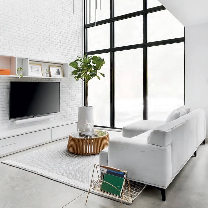 Le bâtiment est implanté dans un très vieux quartier montréalais. Lors des travaux, on l’a presque démoli entièrement, ne conservant que la structure et le mur de briques de la façade. Puis, l’architecte Maurice Martel et la designer Fay Martel ont tout revu: ils ont notamment agrandi la bâtisse vers l’arrière et ajouté un haut mur fenêtré pour faire entrer un maximum de lumière dans la maison.