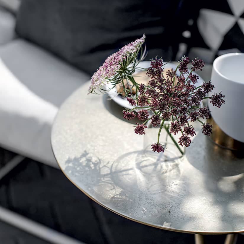 La structure en métal du canapé et de la chaise rembourrée confère au lieu une légèreté que la designer adore. «De loin, on dirait que les coussins flottent dans les airs», s’exclame-t-elle. Les courbes de la table basse en terrazzo viennent adoucir la linéarité du mobilier et du pavement.