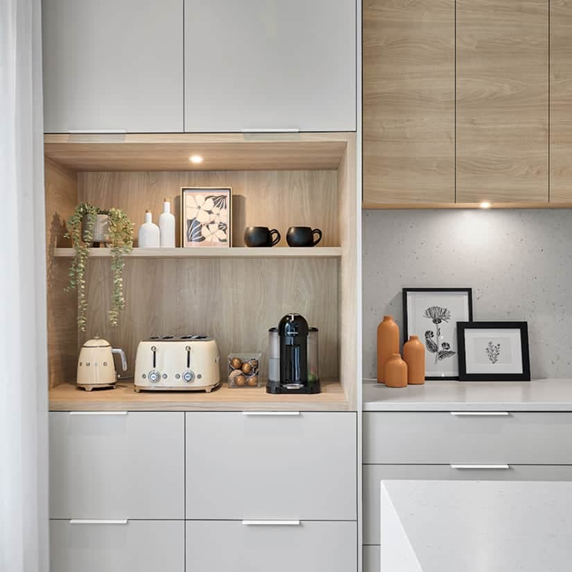 Le design simple et linéaire de la pièce se veut à la fois contemporain et élégant. La cuisine étant adjacente aux aires de réception (le salon et la salle à manger), on a misé sur des tons pâles afin que l’ensemble soit sobre et doux au regard. Les armoires grège en polymère au fini lisse et soyeux résistent aux égratignures ainsi qu’aux marques de doigts. On adore cette matière qui allie un look luxueux à une durabilité exceptionnelle.