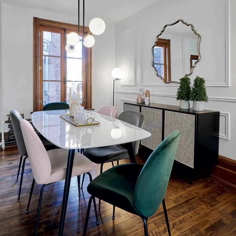 Les rondeurs régnant au sommet des tendances, on a choisi une table à plateau en marbre aux angles arrondis qu'on a entourée de chaises tout en courbes – deux grises, deux roses et deux vertes, histoire d’inviter la couleur et de rendre l’atmosphère plus dynamique. Enfin, les occupants avait besoin d’un rangement pour la vaisselle des grandes occasions et les bouteilles de spiritueux. On a donc proposé ce buffet en bois brun-noir et cannage, des matières très en vogue, qui joue de contraste sur le mur blanc.