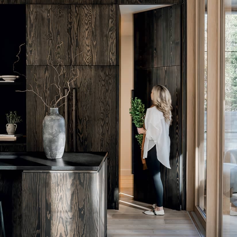 La cuisine s’habille de boiseries sombres, riches et profondes, apportant une élégance mystérieuse et intemporelle à l’espace. Les panneaux soigneusement conçus dissimulent avec finesse le garde-manger et les électroménagers, créant un effet de continuité parfaite où la fonctionnalité se fait oublier au profit d’une esthétique épurée.