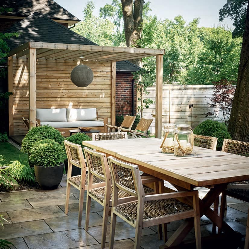 La cour arrière est divisée en deux zones distinctes. Le coin-repas, délimité par un revêtement en pierre calcaire, a été aménagé près de la maison pour simplifier les allées et venues lors des réceptions. De là, une allée en gravier mène au salon d’été, organisé sous une pergola en cèdre. «Le mur plein permet de dissimuler le garage en brique, explique Leigh.