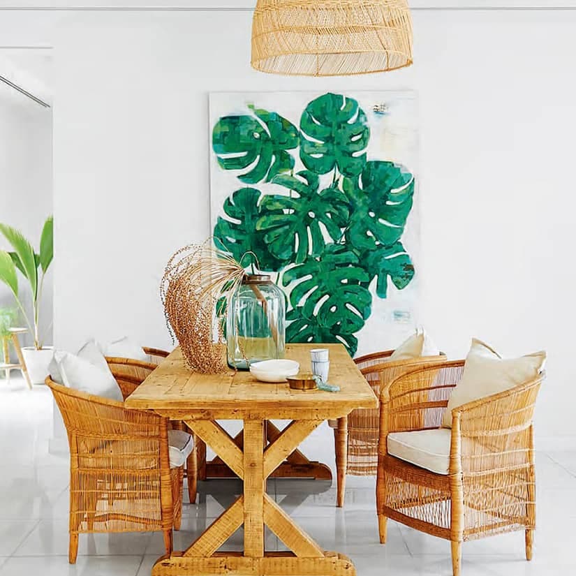 Les dernières générations de meubles de jardin sont si élégantes que cela nous donne envie de les inviter dans la maison. Ces chaises en fibre naturelle, par exemple, campent une ambiance légère et décontractée qui rappelle les vacances. On a accentué cet effet en ajoutant un luminaire tressé ainsi qu’un grand tableau à motif de feuillage exotique.