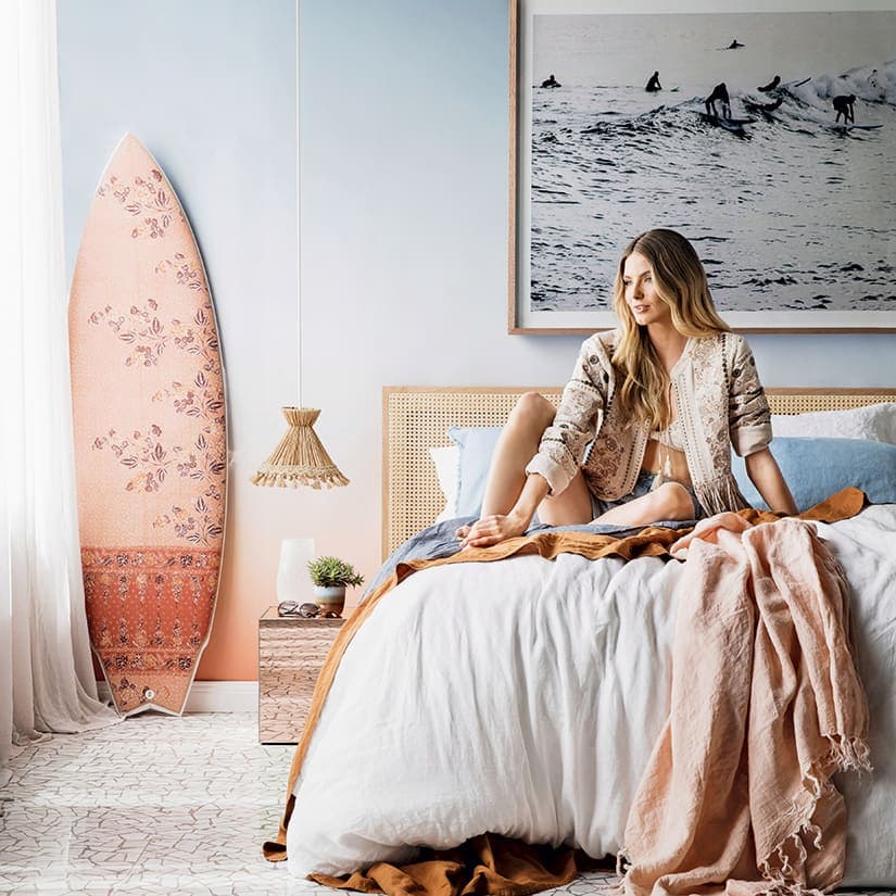 Planche de surf aux couleurs assorties à la literie pastel, tête de lit cannée, photo ou tableau illustrant la mer... les accents déco californiens font songer à la plage.