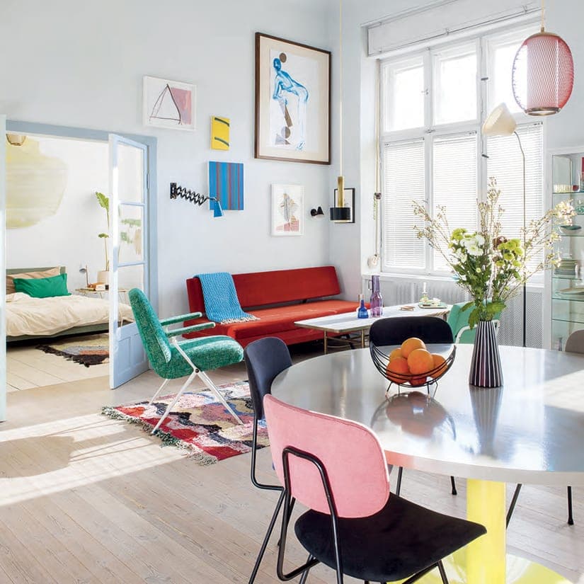 Canapé rouge, piètement de table jaune canard, chaises roses, mauves ou vertes: le style mid-century modern assaisonné de couleurs bien affirmées égaye l’aire ouverte de cet appartement.