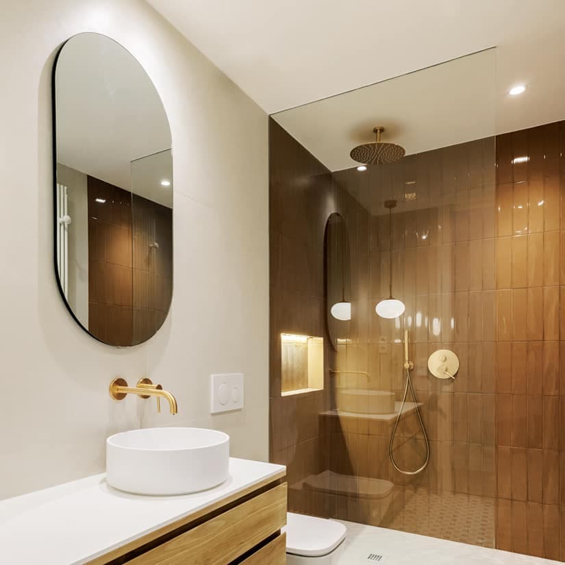 Qui a dit que la douche devait toujours être cantonnée à un coin? On en fait l’élément central, séparant le bain et la toilette de manière harmonieuse.